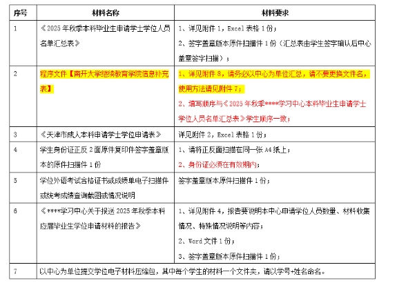 9、请中心为单位汇总学生填写的【南开大学继续教育学院信息补充表】,填写时务必按照《补充信息程序使用说明》在对话框中填写,填写顺序与《2025年秋季****学习中心本科毕业生申请学士学位人员名单汇总表》学生顺序一致,且不可更改程序文件及其文件名,乱改表格格式及文件名将严重影响正常工作流程和信息生成,请中心老师做好传达和审查和汇总工作。