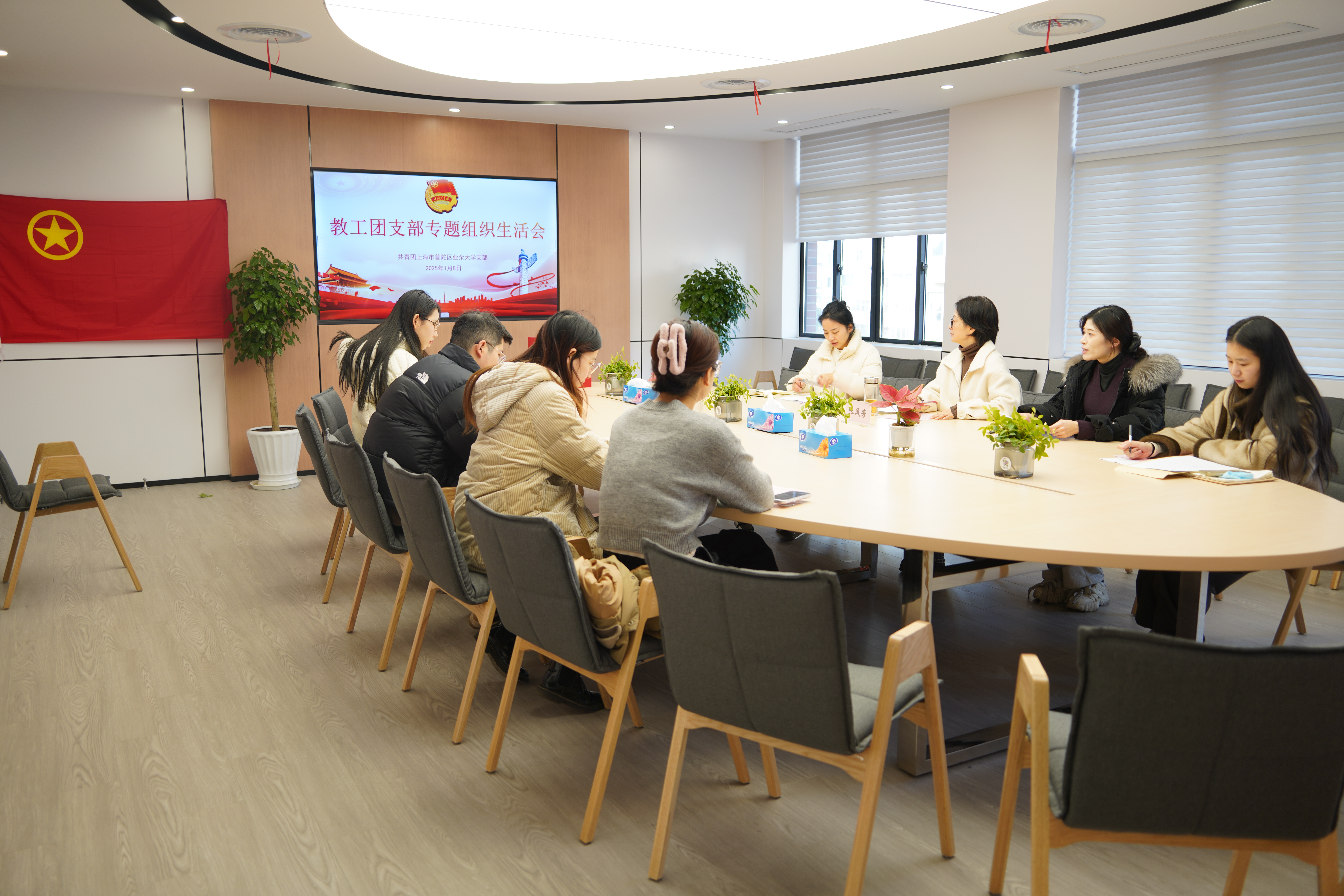 2025年1月8日,普陀区业余大学教工团支部召开专题组织生活会,旨在深入学习贯彻党的二十届三中全会精神,紧密结合团员思想、学习和工作实际,激发团员思想政治觉悟和责任担当。校党总支副书记、副校长张凤芳到会指导。