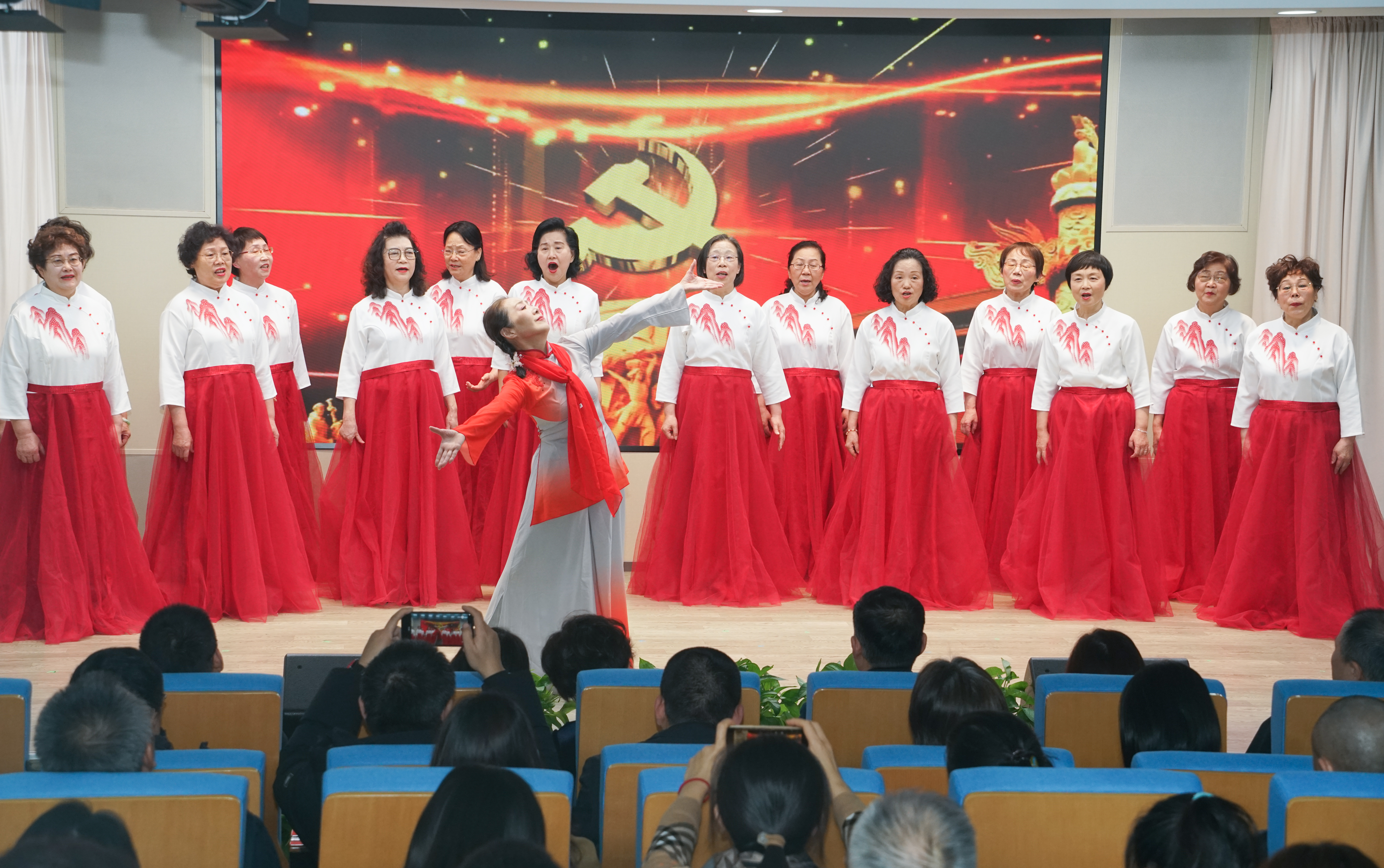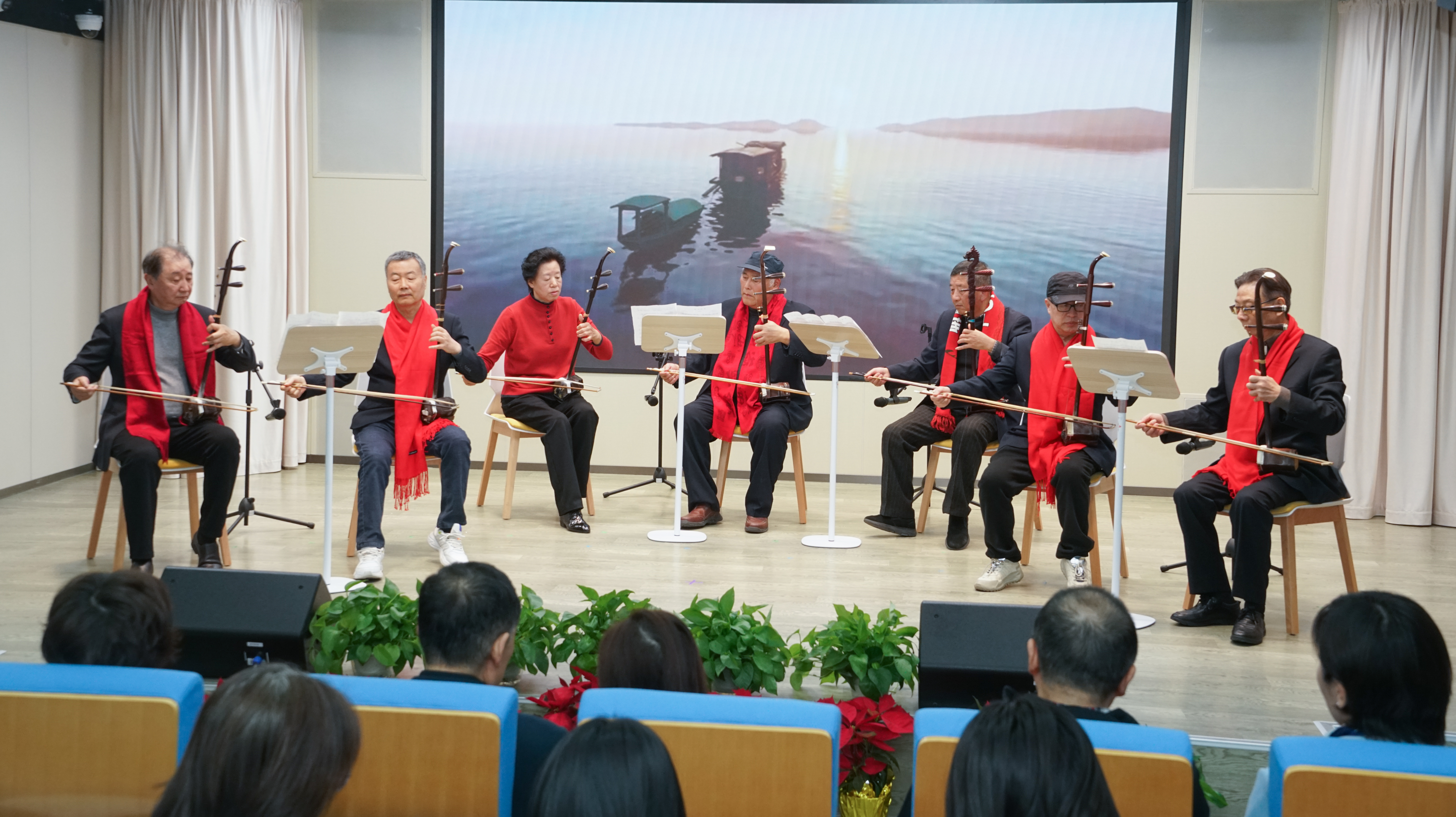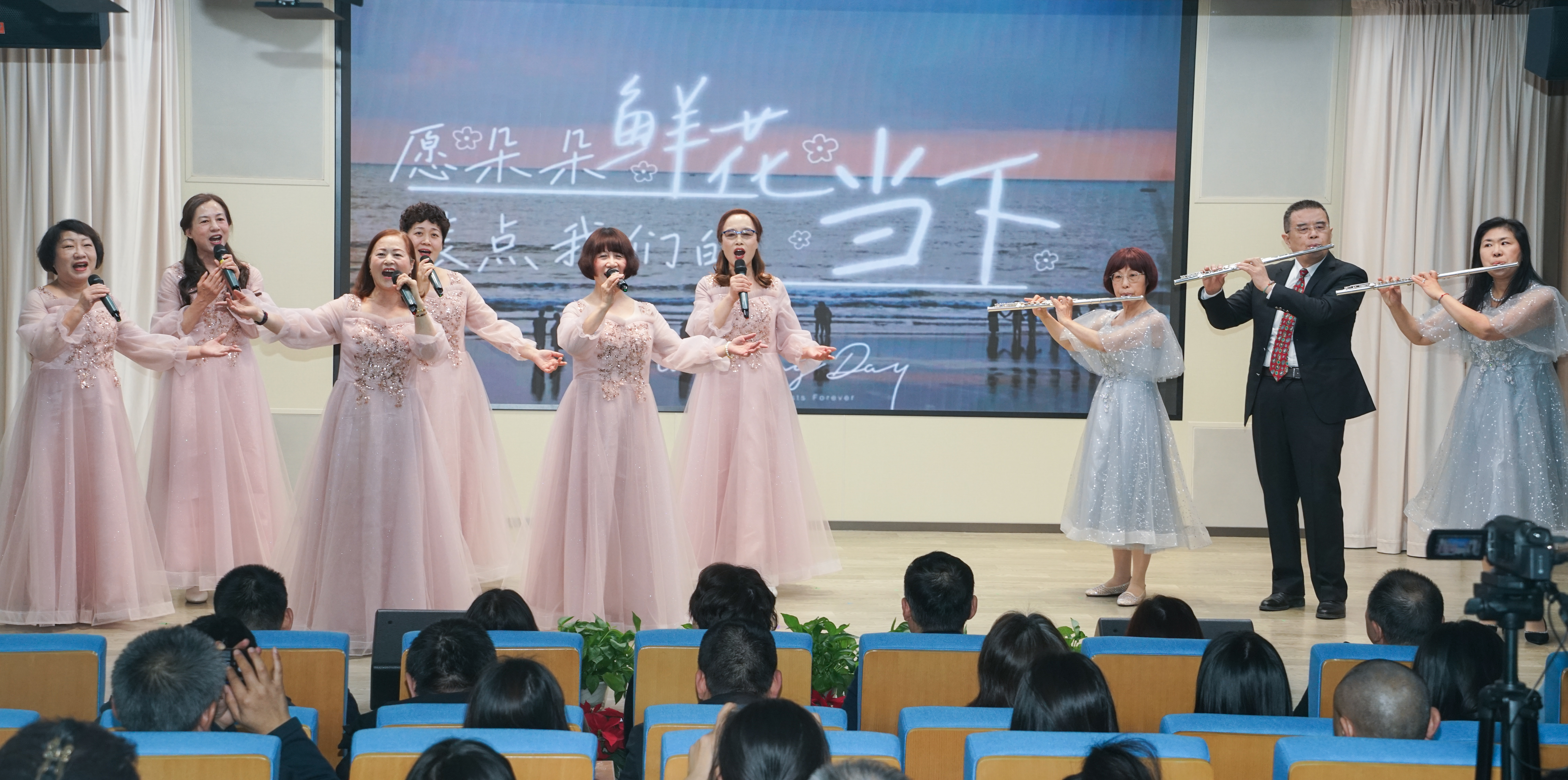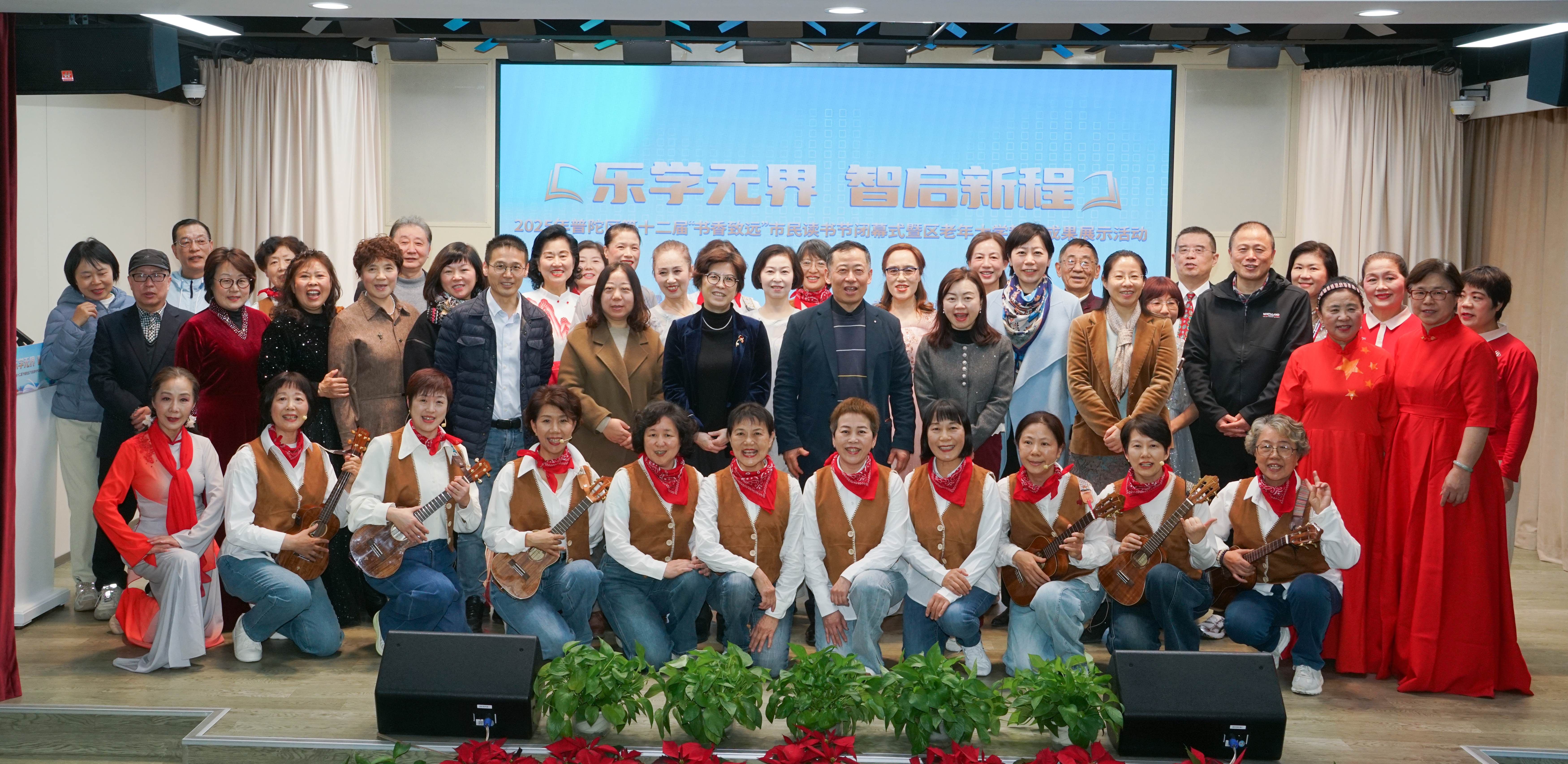 教学成果展示环节,区老年大学学员和学习团队轮番登场,带来一系列形式多样、特色鲜明的节目。情景朗诵《我喜欢出发》生动展现老年群体重返学习的热忱,诠释“活到老、学到老”的真谛;学习故事讲述《岁月留声·团队印记》真挚动人,以鲜活的成长事例再现并肩前行的互助历程,传递“携手共进、乐学同享”的团队精神;越剧《我把美酒献给你》韵味悠长,以婉转唱腔诉说“莫道桑榆晚,为霞尚满天”的生活态度;中阮合奏《上海滩》奏响经典旋律,尽显民族乐器独特韵味;诗乐舞《将进酒》将豪迈诗句、悠扬乐声与优美舞姿相融,打造穿越千年的视听体验;歌舞《唱支山歌给党听》饱含对党的赤诚,唱出乐学享老的美好憧憬;长笛协奏小组唱《岁月里的花》以笛声伴歌声,将时光淬炼的学习成果娓娓道来;舞蹈《一路山程》以舒缓雅致的身姿,彰显银龄生活的活力风采。全场活动在尤克里里手鼓合奏《童年》轻快灵动的旋律中落下帷幕,唤起了一代人的青春回响。