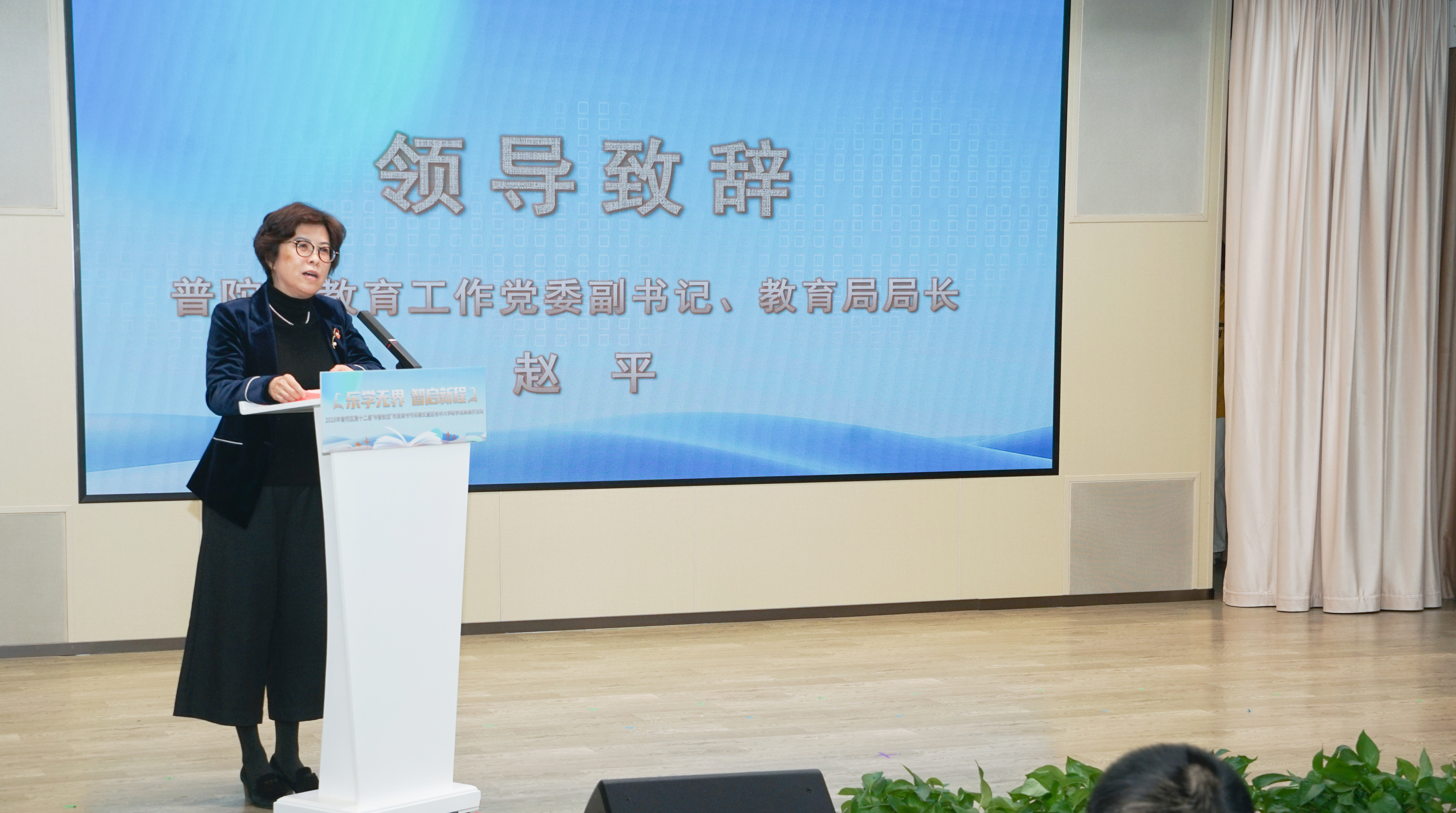 赵平代表区教育局致辞,全面回顾近年来普陀区在全民阅读与老年教育工作中取得的显著成效,勉励广大终身教育工作者凝心聚力、积极作为,持续营造全民阅读浓厚氛围,推动老年教育转型迭代与扩容提质,以书香赋能美好生活,以乐学书写银龄华章,让终身学习理念深入人心。
