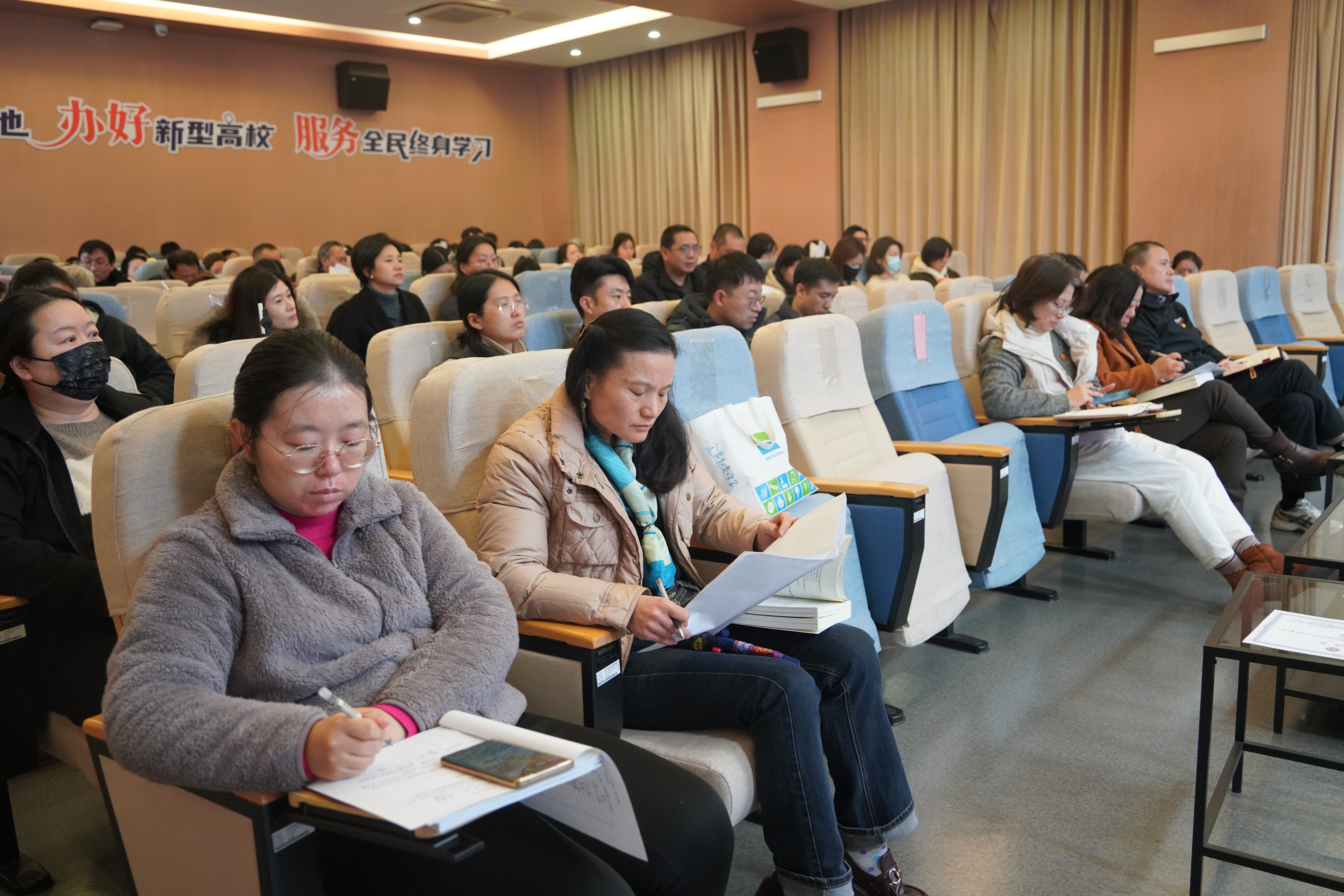 各党支部书记分享结束后,张喆作总结讲话,她强调,全校教职工要持续深入学习《习近平谈治国理政》第五卷,切实以党的创新理论武装头脑、指导实践,为学校高质量发展注入强劲动力。随后,她以“深化办学思想核心内涵 凝练学校新时代发展校园精神”为题,将理论学习成果与学校终身教育办学实践紧密结合,对办学思想体系进行系统性阐释。为让抽象的办学理念更易感知、更入人心,她以“树”为喻,将完整办学体系具象化:校园精神是树根,办学理念是树干的生长方向,办学目标是树的生长高度,办学策略是树干的输送管道,校风校训是树叶与树干的姿态,办学愿景是树的终极形态。这一生动阐释将抽象的办学思想转化为具体的发展路径,有效凝聚共识,让全体教职工对学校发展蓝图有了更清晰的认知与认同。此次会议将理论学习与办学实践紧密结合,既推动了党的创新理论入脑入心,又凝聚了发展共识。全校教职工及党员纷纷表示,将以此次学习为契机,把学习成果转化为履职尽责的实际行动,助力学校在终身教育高质量发展道路上持续迈进。