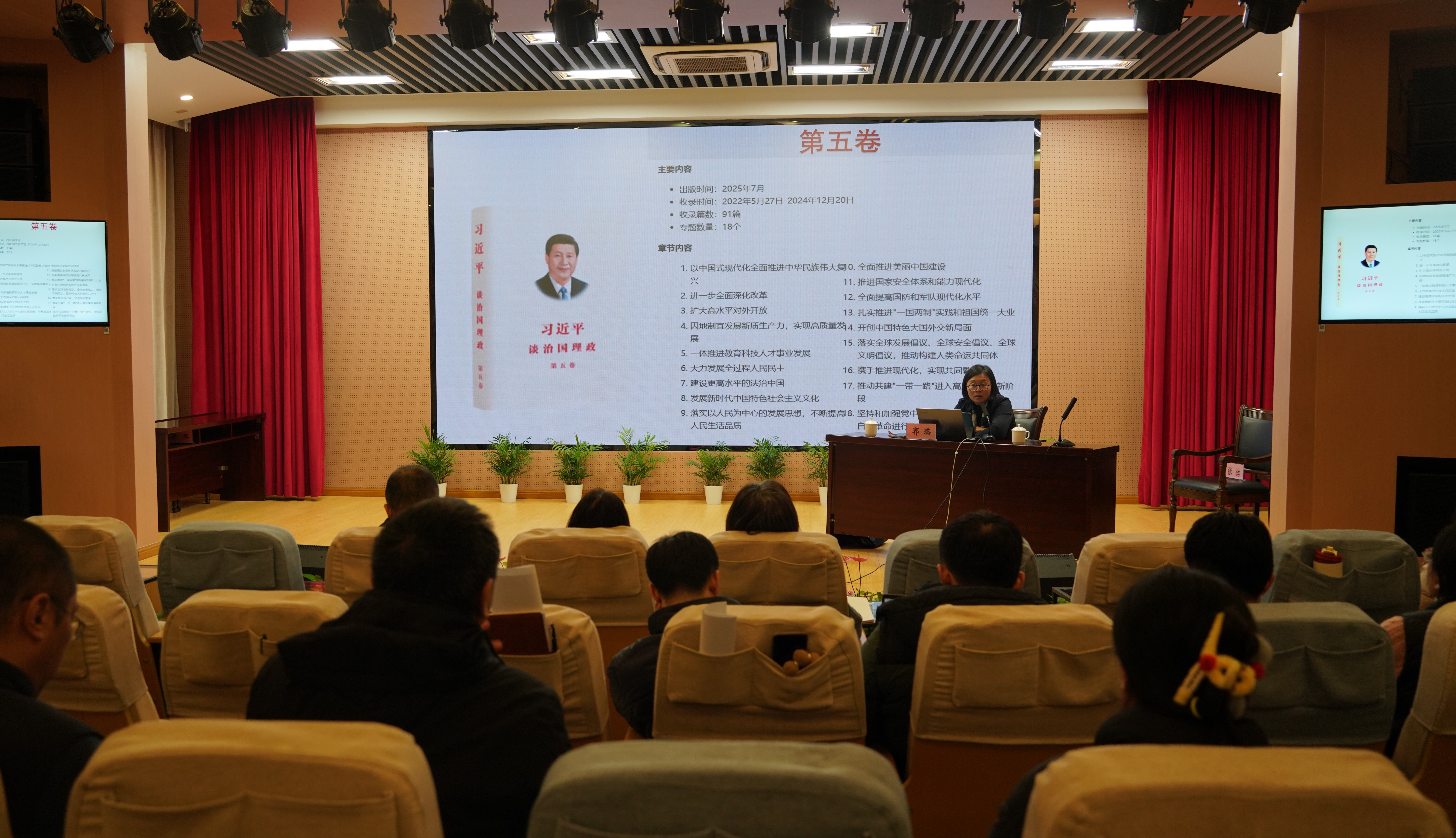 会上,上海市普陀区区委党校专家郭璐以“深入学习贯彻《习近平谈治国理政》第五卷 奋力谱写中国式现代化新篇章”为题讲授专题党课。她首先系统梳理《习近平谈治国理政》第一卷至第五卷的核心要义和思想脉络,随后聚焦第五卷展开重点解读。《习近平谈治国理政》第五卷始终围绕一个核心主线—破解中国发展不同阶段的突出矛盾;始终坚守一个根本立场—以人民为中心;始终遵循一个实践逻辑—问题导向、系统观念、守正创新。第五卷既是对前四卷思想的集成总结,更是对新发展阶段需求的理论回应,为“十四五”到“十五五”的战略升维,提供了最直接的思想支撑。它的诞生,标志着习近平新时代中国特色社会主义思想的进一步丰富完善,为我们在新征程上推进中国式现代化提供了强大思想武器。