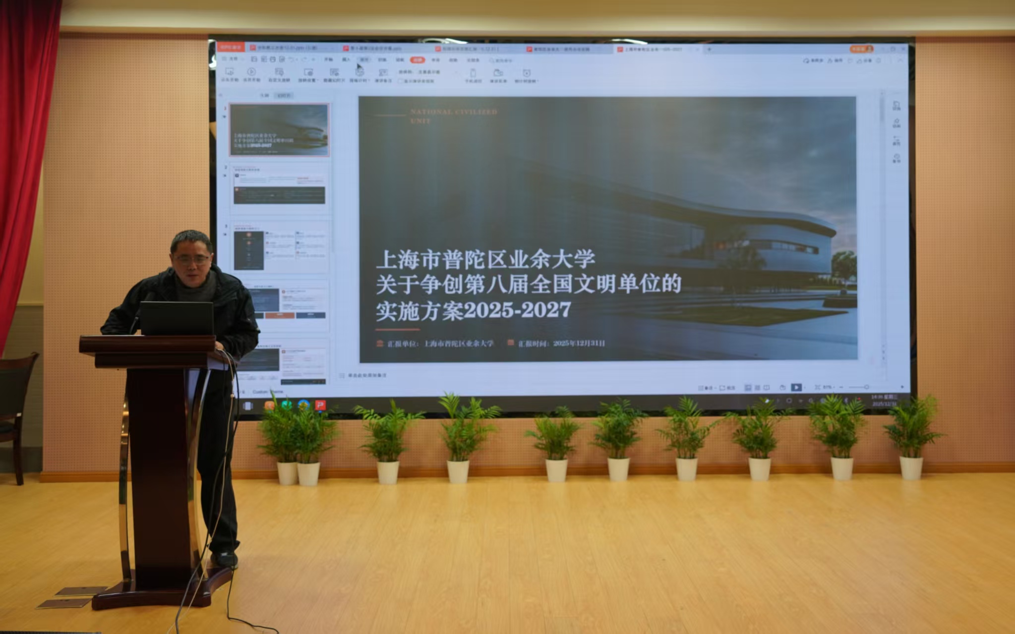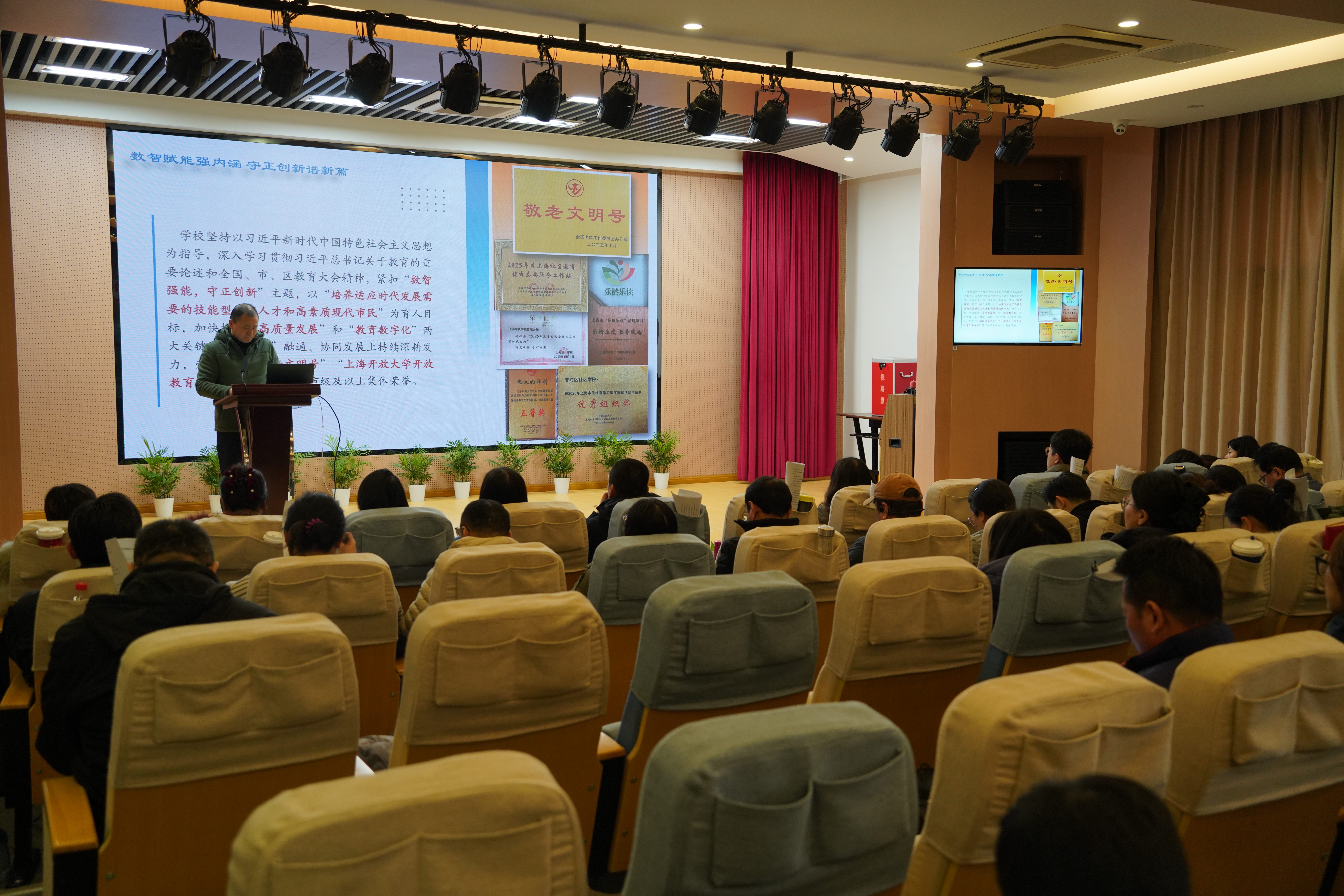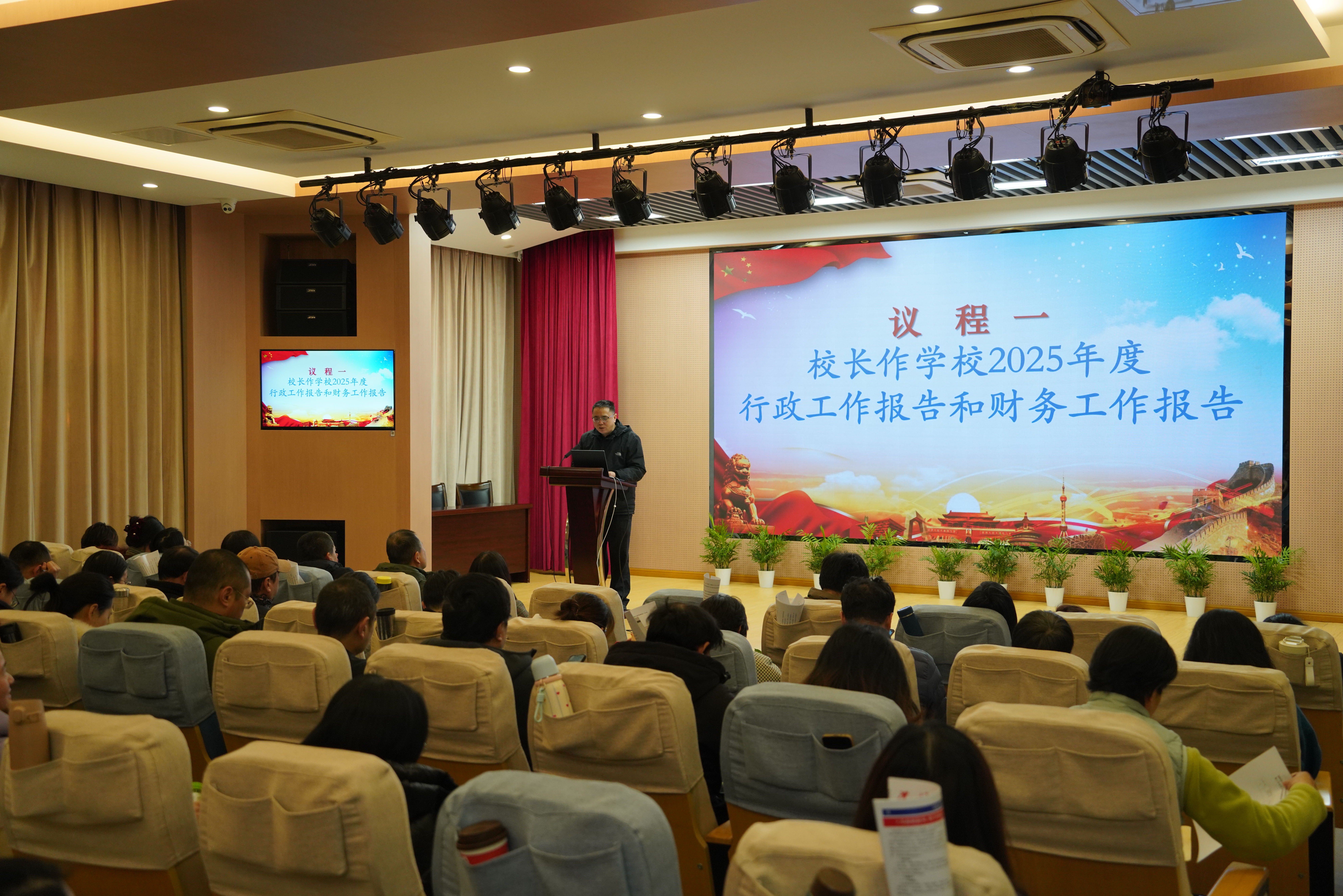 在闭幕式上,党总支副书记、校长徐文清向大会作了年度行政工作报告和财务工作报告。报告全面回顾总结了2025年学校各项工作取得的显著成绩。过去一年,学校紧扣“数智强能,守正创新”年度主题,在立德树人、教学改革、社会服务、数字化转型等方面取得了扎实进展,“四教”融通、协同发展的格局进一步巩固。报告同时展望未来,明确了下一步深化改革、提升终身教育服务品质、助力学习型城区建设的发展方向。