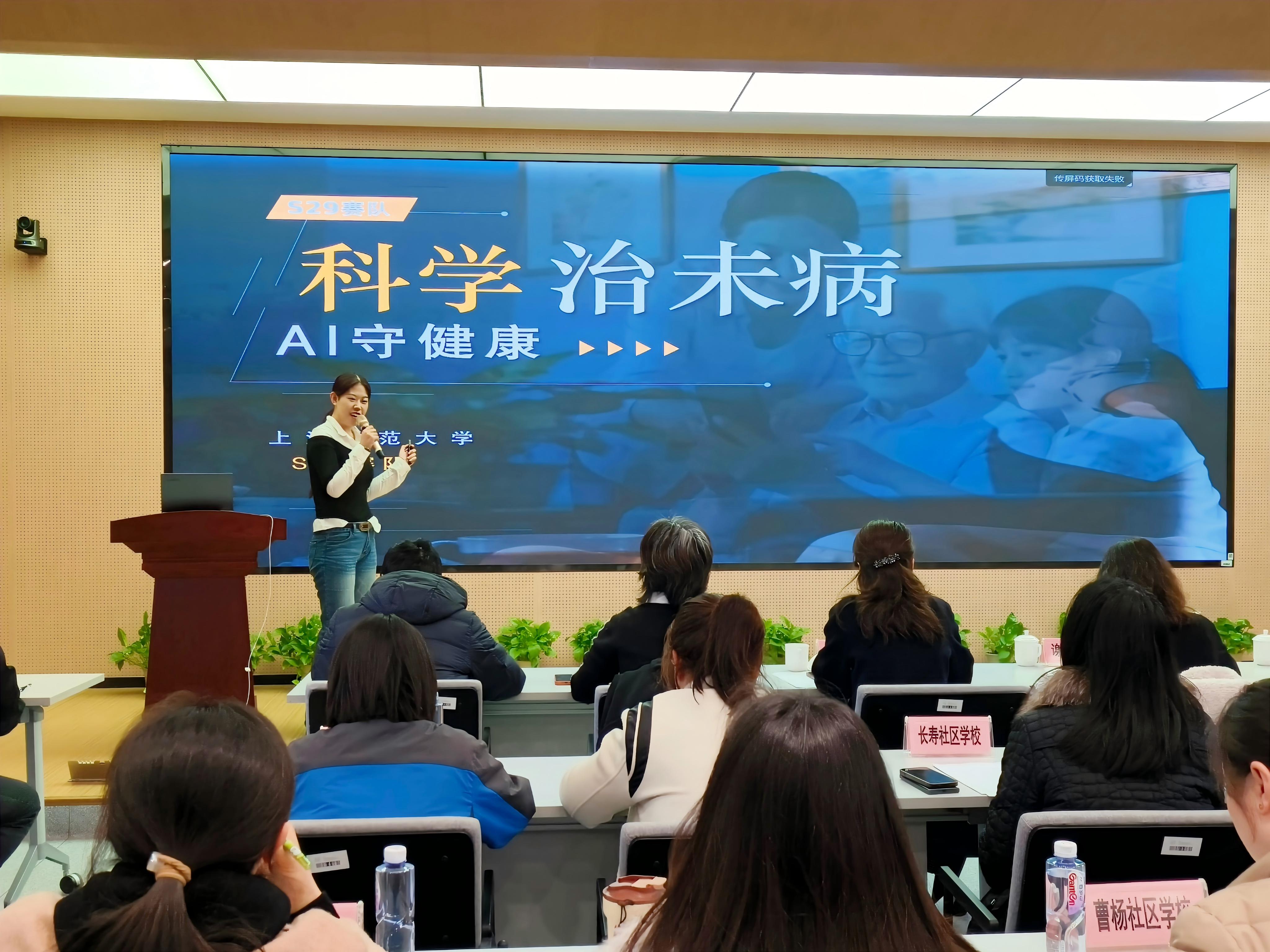 比赛现场,10支赛队依次登台,围绕课程设计思路、教学特色与落地成效展开说课,并现场回应评委提问。课程内容既有聚焦老年人AI健康管理的《科学治未病 AI守健康》,也有以游戏化课程专注嗓音健康的《声动普陀》;既有从五禽戏切入的中医养生课《以戏入道 以身明心》,也有带领老年人探索大模型应用的《未来的密钥》。此外,《解密豆包》帮助老年人快速上手人工智能工具,《百年旗袍里的海派文化与记忆传承》以服饰为载体传承海派文化,《社区安全赋能课》用“老物件故事会”串联两代人的安全守护,《从情绪平衡到关系改善:正念心理课》关注青少年社会情感能力,《岐黄强骨》融合中西医智慧守护老年人骨骼健康,《考古XX:一起来做博物馆策展人!》则让文物“活过来”,通过与文物“对话”的方式了解历史。10门课程涵盖数字素养、健康素养、文化素养和生活素养类别,充分体现了当代大学生的创新思维与社会担当。
